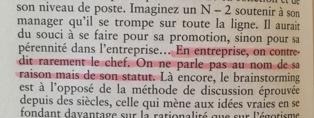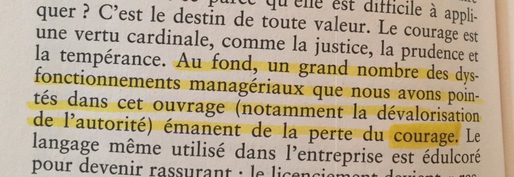 « Les managers préfèrent les contrôles et les process à l’autorité assumée ». Je ne peux que le confirmer. Que ce soit moi ou mes proches : les process rassurent et évitent aux personnes (pourtant « responsables ») d’assumer d’éventuelles prises de risque. Est-ce normal ? Cela ne me le semble pas. Et le courage ? Le livre relate beaucoup cette notion.