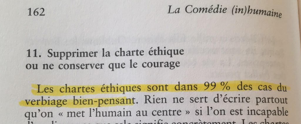 « La tempérance est une vertu cardinale » / « Percevoir ce pourquoi nous travaillons et en mesurer les résultats » / « C’est quand le sens est absent et quand l’amour du travail bien fait s’érode que les entreprises (et institutions publiques) se perdent en objectifs multiples et insignifiants et mobilisent maladroitement des dérivatifs comme le jeu et le bonheur » / « Une forte culture d’entreprise est nécessaire pour réguler l’autonomie » / « Seule la simplicité d’une organisation laisse s’épanouir l’autonomie ».