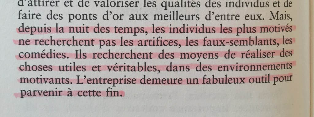 Si je reviendrai sur cet ouvrage, et plus amplement sur le management mis en parallèle avec mes observations et expériences, je vous laisse sur ma prise de notes et quelques citations. J’ai aussi usé de mes stabilos, comme vous avez pu le voir avec quelques captures.