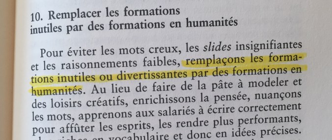 Ce passage peut être complété avec Hegel : « Hegel nous enjoint de comprendre les hommes, des hommes qui veulent voir l’effet de ce qu’ils font. De nombreux dirigeants d’entreprise nous disent : les jeunes veulent avoir un impact. Derrière cette formulation langagière hasardeuse se cache une grande idée : le travail doit façonner le monde et l’individu. Dans vos entreprises, dirigeants et managers, ôtez tout ce qui n’est pas indispensable au cœur de métier de vos salariés. Considérez-les comme des artisans et non comme des robots. Les robots n’ont pas conscience d’eux-mêmes. Laissons-leur le travail automatisable. Utilisez l’intelligence humaine pour ce qu’elle est : sa capacité à mettre en œuvre un projet pour transformer la réalité. Ne croyez pas que cette injonction soit réservée aux ultra-diplômés. Une femme de ménage peut avoir plus facilement conscience de son travail qu’un administratif. »