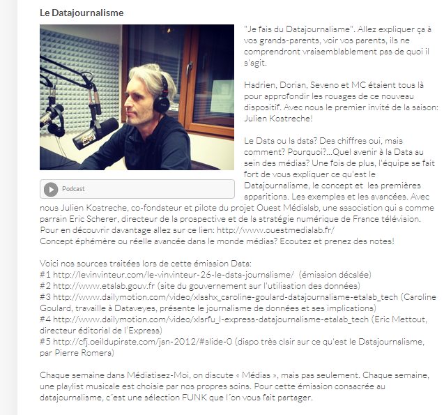 Le Data ou la data? Des chiffres oui, mais comment? Pourquoi?…Quel avenir à la Data au sein des médias? Une fois de plus, l’équipe se fait fort de vous expliquer ce qu’est le Datajournalisme, le concept et les premières apparitions. Les exemples et les avancées. Avec nous Julien Kostreche, co-fondateur et pilote du projet Ouest Médialab, une association qui a comme parrain Eric Scherer, directeur de la prospective et de la stratégie numérique de France télévision. Pour en découvrir davantage allez sur ce lien: http://www.ouestmedialab.fr/