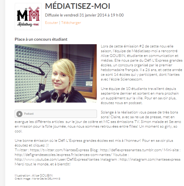 Lors de cette émission #2 de cette nouvelle saison, l’équipe de Médiatisez-moi a rencontré Alice GOUBIN, étudiante en communication et médias. Elle nous parle du Défi L’Express grandes écoles, un concours organisé par le premier hebdomadaire français. Il a 26 ans et cette année ce sont 14 écoles qui y participent, dont Nantes avec l’école Sciencescom.
