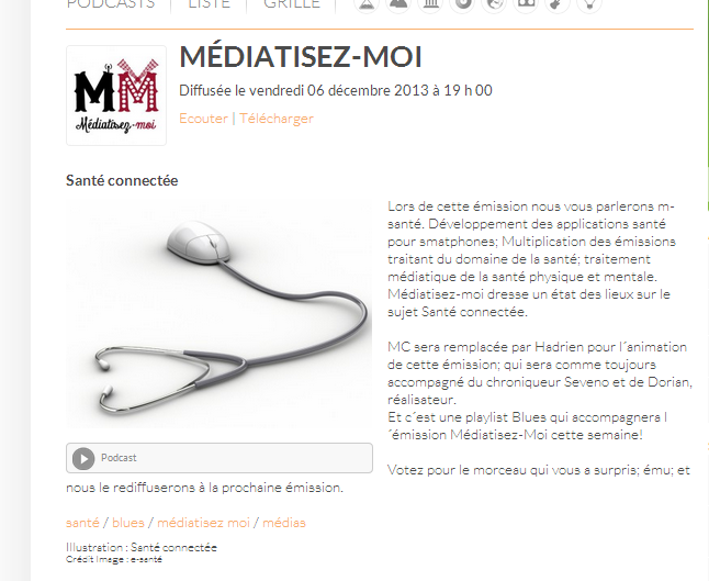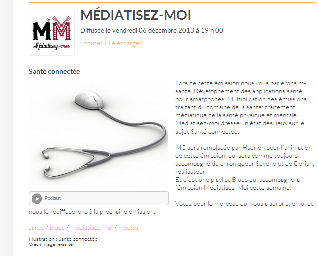 Lors de cette émission nous vous parlerons m-santé. Développement des applications santé pour smatphones; Multiplication des émissions traitant du domaine de la santé; traitement médiatique de la santé physique et mentale. Médiatisez-moi dresse un état des lieux sur le sujet Santé connectée.