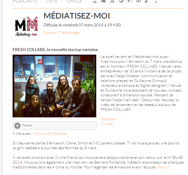 Avec nous pour l’émission du 7 mars une startup est à l’honneur: FRESH COLLABS. Manuel Leray, entrepreneur de 30 ans à l’initiative de ce projet est avec Nadja Altpeter (communication et relations presse) et Guillaume Grimaud (directeur artistique et digital designer).