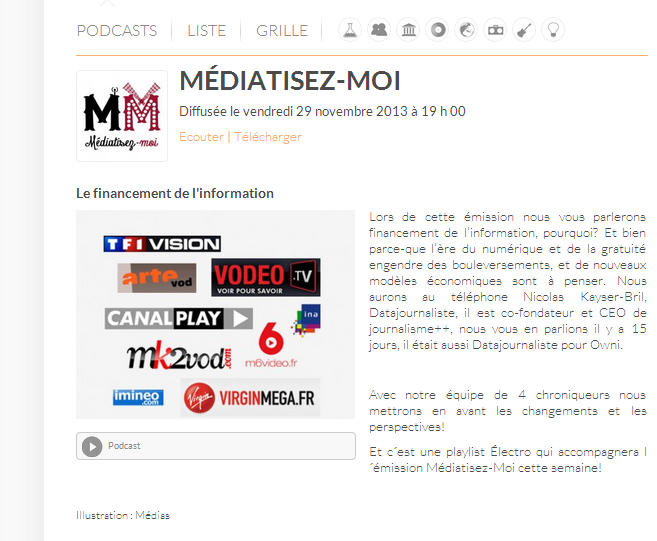 Lors de cette émission nous vous parlerons financement de l’information, pourquoi? Et bien parce-que l’ère du numérique et de la gratuité engendre des bouleversements, et de nouveaux modèles économiques sont à penser. Nous aurons au téléphone Nicolas Kayser-Bril, Datajournaliste, il est co-fondateur et CEO de journalisme++, nous vous en parlions il y a 15 jours, il était aussi Datajournaliste pour Owni.