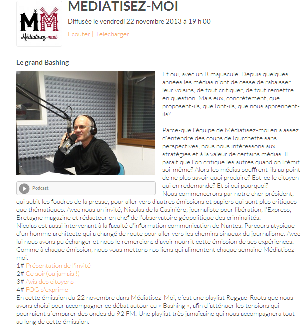 Nicolas est aussi intervenant à la faculté d’information communication de Nantes. Parcours atypique d’un homme architecte qui a changé de route pour aller vers les chemins sinueux du journalisme. Avec lui nous avons pu échanger et nous le remercions d’avoir nourrit cette émission de ses expériences.