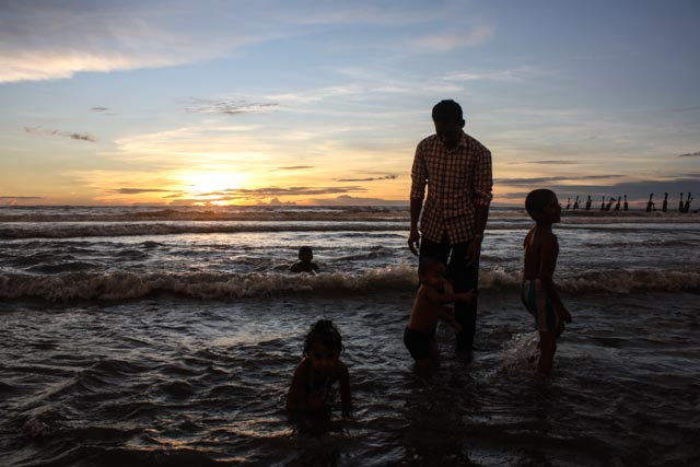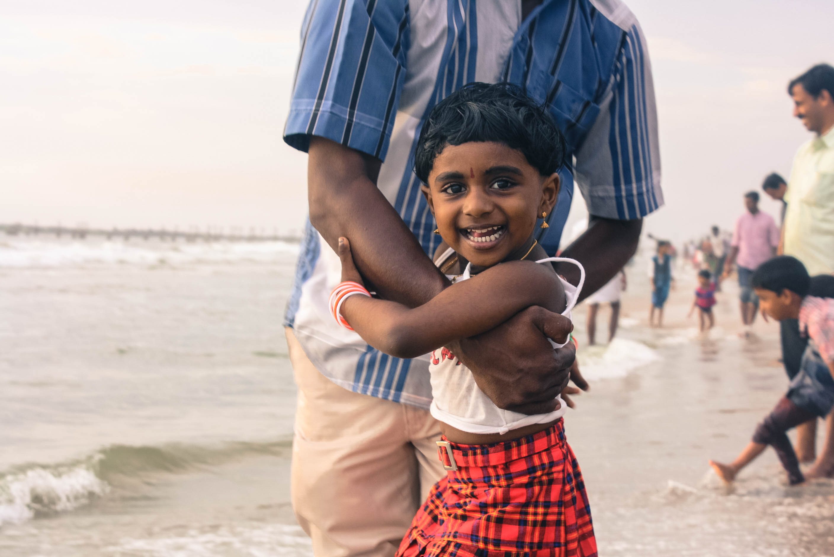 Que de pères, que de mères, que d’enfants… Ici pas de poussette, ce sont les parents qui, à la force des bras, étreignent leurs petits. Une fois de plus je me demande pourquoi je m’en étonne. Peut-être parce que nos divorces ont foutu pas mal de familles en l’air ou parce qu’il y a un rapport beaucoup plus charnel avec mes indiens et leur progéniture. Sur la plage de Calicut, il y a beaucoup d’amour ! J’aime y voir les foulards colorés, les sourires, les familles et les pieds nus dans l’eau. Sentir le vent chaud, observer les indiens curieux, me laisser bercer par le ressac d’une mer agitée… J’aime m’asseoir sur le sable, regarder droit devant et laisser passer de longues minutes après avoir contemplé l’horizon. Entre Saint-Malo et L’Inde, je suis toujours happée par le large…
