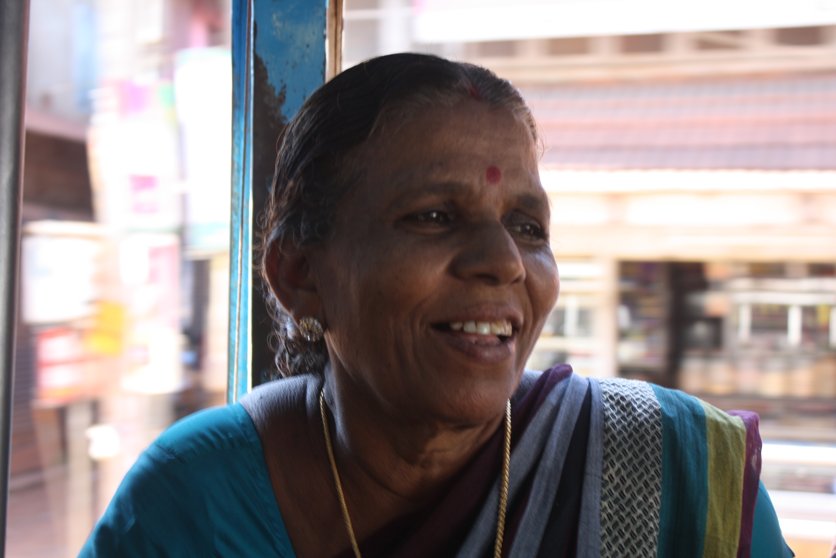 La vie sur le campus est très agréable, mais j’ai souvent envie de prendre l’air, monter derrière une moto et faire un tour. Malgré le danger, j’adore ça. Ici il n’y a pas de règles et il faut avoir confiance en la personne qui vous conduit. Au final je trouve ça très amusant, même s’il y a de graves accidents. Surtout qu’ils ne portent pas de casque. En ville, c’est obligatoire, mais uniquement pour le conducteur. Les cheveux au vent je regarde les petits magasins de mon village à Kunnamangalam, juste en dessous du campus. Beaucoup de regards, avec sans doute cette question : « mais qui est cette femme blanche ? »